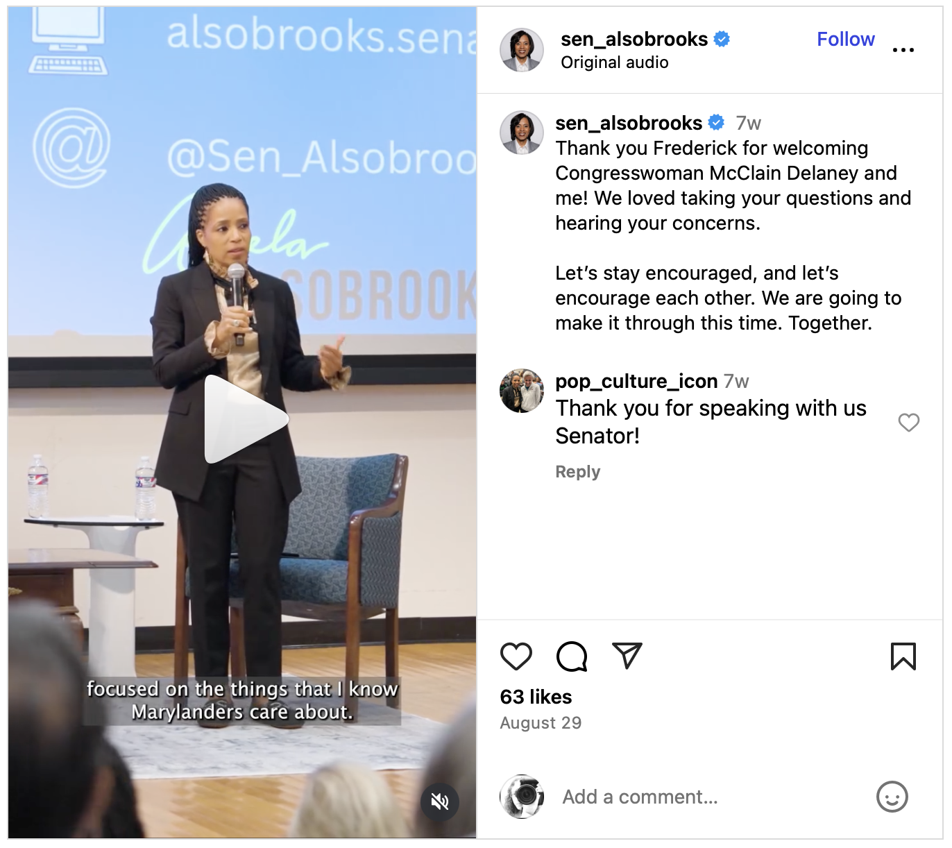 Here’s a video that I filmed for Senator Angela Alsobrooks at a town hall in Frederick, MD. I shot this with a vertical-only directive, which is tricky when you’re filming on a horizontal format camera. (I’ve devised a plan to make custom frame lines for the next time I’m filming vertical-only.) But considering the limitations, I managed to capture all the pieces I needed with a single camera, and no idea what she was going to talk about in advance.